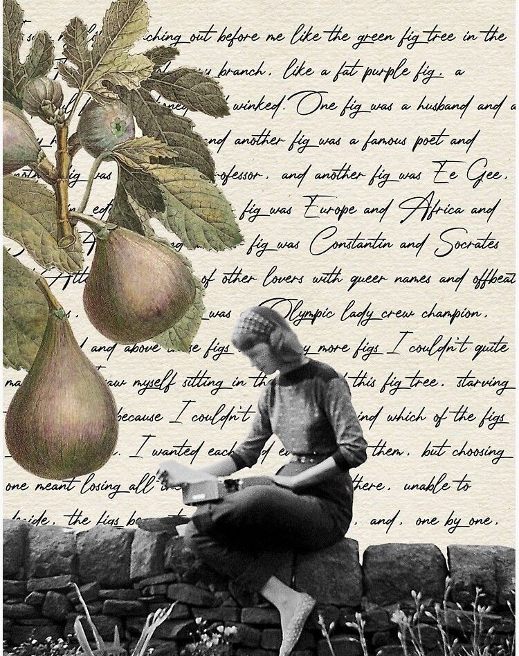 From the tip of every branch, like a fat purple fig, a wonderful future beckoned 𝗮𝗻𝗱 winked. One fig was a husband 𝗮𝗻𝗱 a happy home 𝗮𝗻𝗱 children, 𝗮𝗻𝗱 another fig was a famous poet 𝗮𝗻𝗱 another fig was a brilliant professor, 𝗮𝗻𝗱 another fig was Ee Gee, the amazing editor, 𝗮𝗻𝗱 another fig was Europe 𝗮𝗻𝗱 Africa 𝗮𝗻𝗱 South America, 𝗮𝗻𝗱 another fig was Constantin 𝗮𝗻𝗱 Socrates 𝗮𝗻𝗱 Attila 𝗮𝗻𝗱 a pack of other lovers with queer names 𝗮𝗻𝗱 offbeat professions, 𝗮𝗻𝗱 another fig was an Olympic lady crew champion, 𝗮𝗻𝗱 beyond 𝗮𝗻𝗱 above these figs were many more figs I couldn’t quite make out». (p. 73)